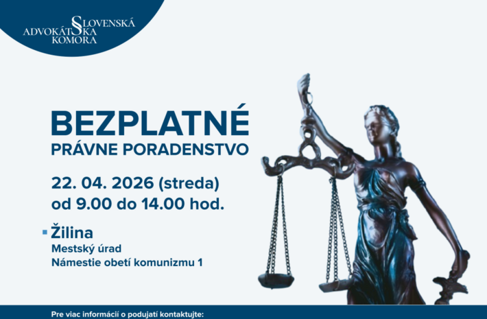 Slovenská advokátska komora pripravuje aj tento rok celoslovenský projekt bezplatného právneho poradenstva. Uskutoční sa 22. apríla 2026 od 9.00 do 14.00 hodiny a zapojí sa doň rekordných 24 miest po celom Slovensku. V Žiline budú advokátky a advokáti k dispozícii vo veľkej zasadačke mestského úradu. Záujemcovia sa nemusia vopred registrovať, stačí prísť priamo na miesto v uvedenom čase.