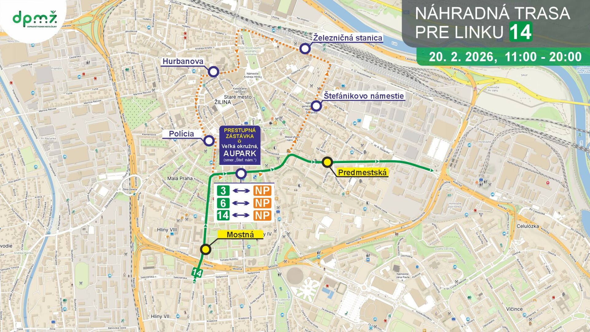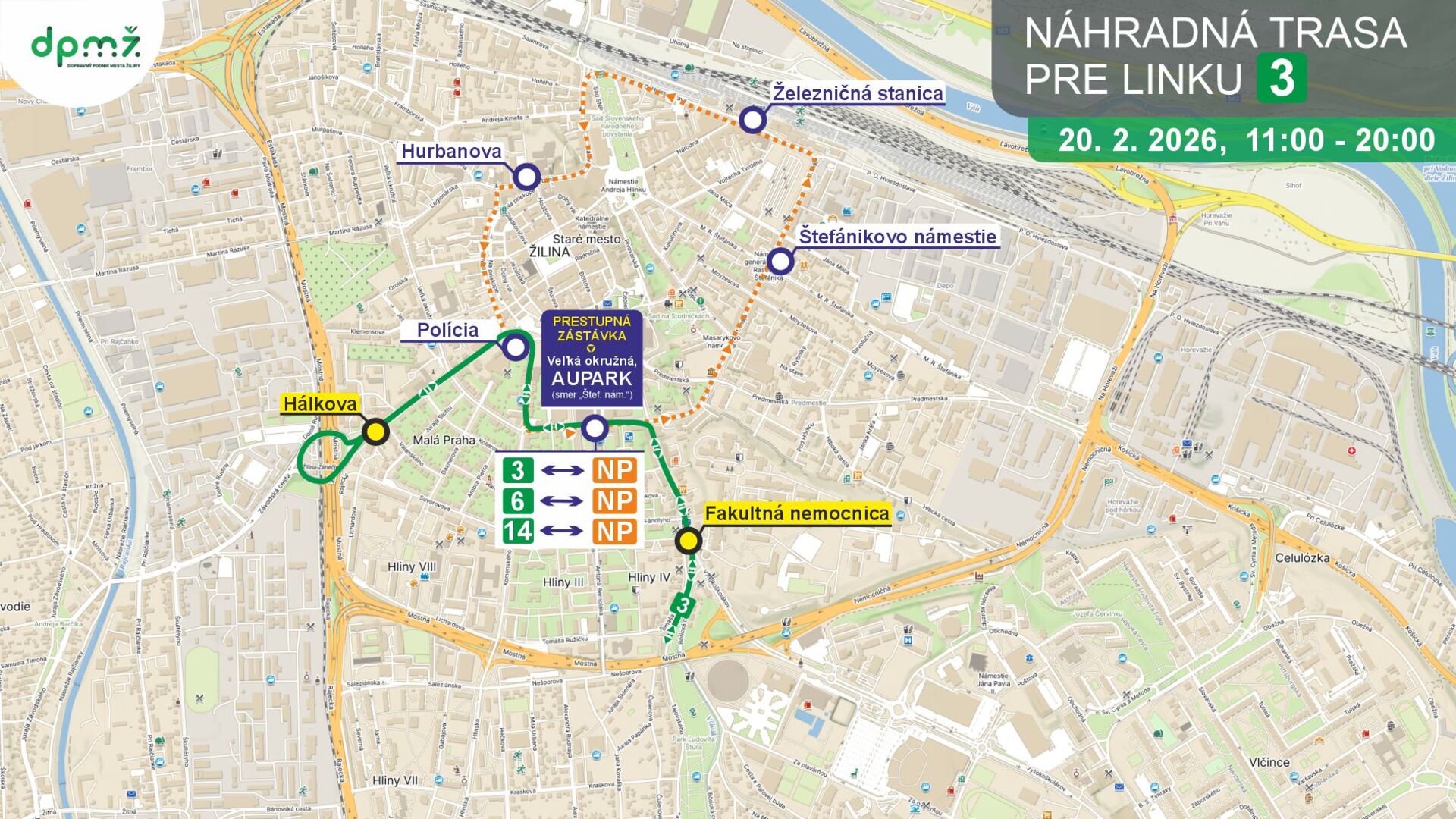 ⚠️ Spoje trolejbusových liniek č. 3, 4, 6, 14 a 16 budú premávať po náhradných (obchádzkových) trasách, pričom na zastávke "Veľká okružná, AUPARK" bude zabezpečený prestup na spoje náhradnej kyvadlovej dopravy ("NP").