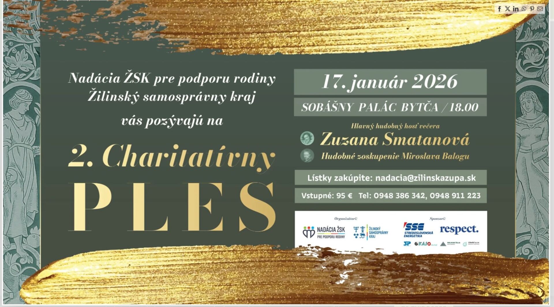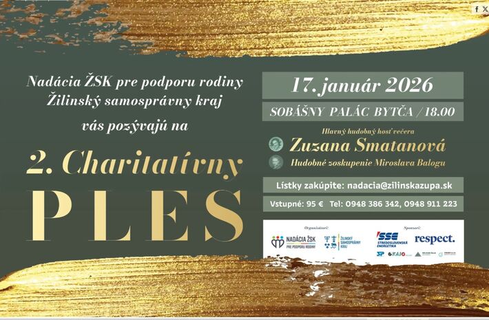 Jeden z najkrajších historických priestorov regiónu – Sobášny palác v Bytči – sa v sobotu 17. januára 2026 o 18.00 premení na miesto, kde sa elegancia stretne s dobrom. Organizátori z Nadácie ŽSK pre podporu rodiny a Žilinského samosprávneho kraja pripravili druhý ročník charitatívneho plesu, ktorý ponúkne bohatý program aj možnosť pomôcť tým, ktorí to najviac potrebujú.