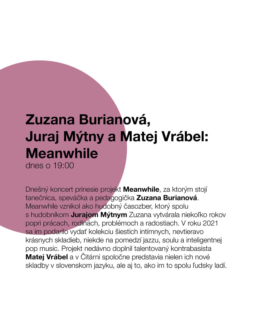 Aprílový koncert prinesie projekt Meanwhile, za ktorým stojí tanečnica, speváčka a pedagogička Zuzana Burianová. Meanwhile vznikol ako hudobný časozber, ktorý spolu s hudobníkom Jurajom Mýtnym Zuzana vytvárala niekoľko rokov popri prácach, rodinách, problémoch a radostiach. V roku 2021 sa im podarilo vydať kolekciu šiestich intímnych, nevtieravo krásnych skladieb, niekde na pomedzí jazzu, soulu a inteligentnej pop music. Projekt nedávno doplnil talentovaný kontrabasista Matej Vrábel a v Čitárni spoločne predstavia nielen ich nové skladby v slovenskom jazyku, ale aj to, ako im to spolu ľudsky ladí.