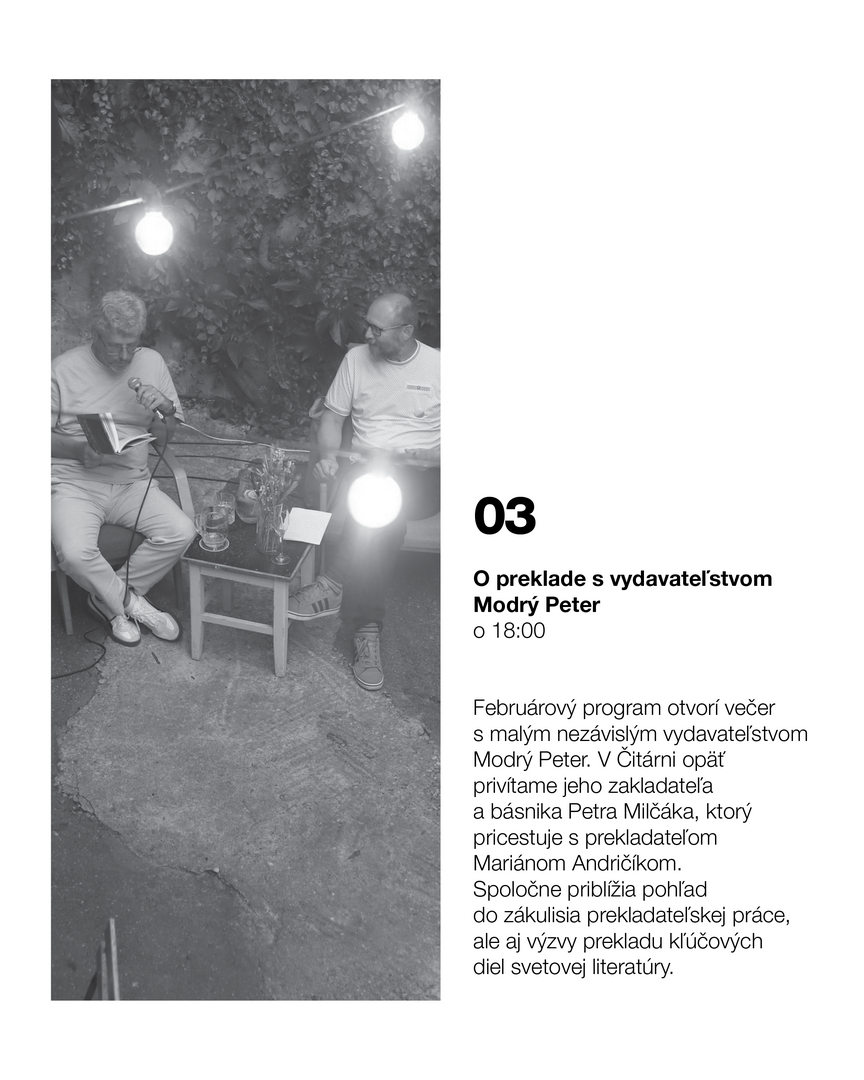 Počas večera sa môžete zoznámiť aj s poéziou posledného žijúceho beatnika Garyho Snydera či s novým kompletným prekladom Shakespearových sonetov, ktoré v preklade Mariána Andričíka vyšli nedávno, koncom roka 2025.