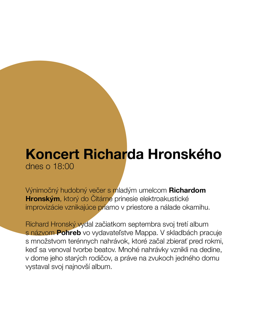 Program prvého februárového týždňa v Čitárni súčasnej literatúry dopĺňa presunutý koncert Richarda Hronského, ktorý v stredu 4. februára o 18. h predstaví elektroakustické improvizácie k albumu Pohreb. Mladý umelec v skladbách pracuje s terénnymi nahrávkami z domu svojich starých rodičov, ktoré sa stali základom celého albumu.