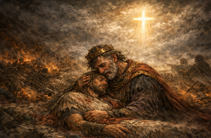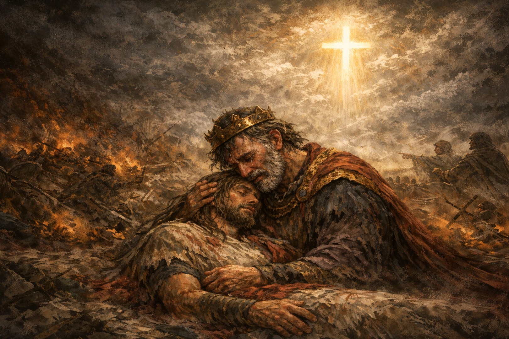 Táto epizóda zo života starozákonného kráľa Dávida zároveň nepriamo naznačuje hlbšiu túžbu: aby niekto dokázal niesť rozdelenosť sveta bez toho, aby ju len potlačil alebo potrestal. Dávid vysloví vetu, ktorú nemôže naplniť: „Kiežby som zomrel namiesto teba.“ Je to túžba po zástupe – suplovaní, po zmierení, po láske silnejšej než konflikt. Pre dnešného čitateľa je to silný obraz: človek môže byť úspešný, uznávaný a mať pravdu – a predsa byť vnútorne zlomený. A práve do takejto zlomenosti vstupuje otázka Boha nie ako ideologická odpoveď, ale ako tichá možnosť, že ani najhlbší rozpor v nás nemusí byť posledným slovom.