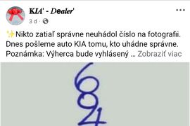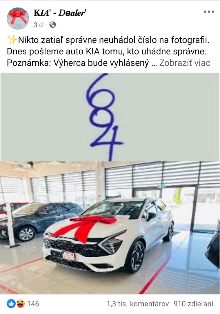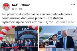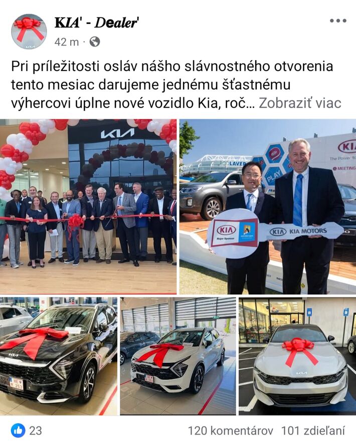 „Pri príležitosti osláv nášho slávnostného otvorenia tento mesiac darujeme jednému šťastnému výhercovi úplne nové vozidlo Kia, ročník 2025. Je to jednoduché: stačí napísať @ a kliknúť na tlačidlo ‚výber‘,“ uvádza sa na jednej z Facebookových stránok, ktorá sa v uplynulých dňoch šíri aj medzi slovenskými používateľmi. Po označení priateľov a kliknutí na tlačidlo sa príspevok rýchlo rozšíri, no reálna výhra neexistuje.