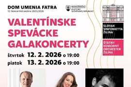 Tradičné spevácke galakoncerty 12. a 13. februára 2026 o 19.00 pod vedením českého dirigenta Zbyňka Müllera prinesie vystúpenia sopranistky Adriany Kučerovej a barytonistu Filipa Tůmu, ktorí predstavia výber najkrajších operných árií, duet a slávnych piesní. Galakoncert s valentínskou príchuťou sľubuje nezabudnuteľný večer plný hudobných emócií a krásy.