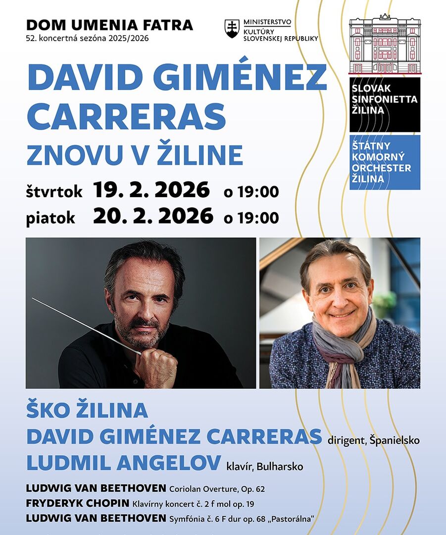 Svetoznámy dirigent David Giménez Carreras, synovec legendárneho tenoristu Josého Carrerasa, sa po úspešných minulých sezónach vracia do Domu umenia Fatra v Žiline 19. a 20. februára 2026 o 19.00. Na pódiu vystúpi spolu s bulharským klavírnym virtuózom žijúcim v Španielsku, Ludmilom Angelovom, ktorý predvedie pôsobivý Klavírny koncert č. 2 Fryderyka Chopina. Program večera doplnia Beethovenova predohra Coriolan a Symfónia č. 6 „Pastorálna“, čím sľubuje nezabudnuteľný hudobný zážitok pre všetkých milovníkov klasickej hudby.