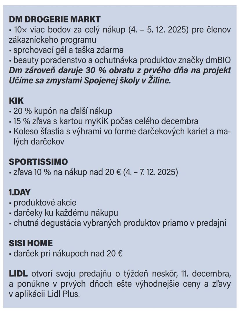 Jedným z najaktívnejších partnerov je dm drogerie markt, ktorá počas 4. a 5. decembra ponúkne členom zákazníckeho programu až desaťnásobok bodov za celý nákup. Okrem toho zákazníci získajú sprchovací gél a tašku zdarma, pripravené bude aj beauty poradenstvo či ochutnávka produktov dmBIO. Prvý deň otvorenia má navyše charitatívny rozmer – dm venuje 30 % obratu na projekt Učíme sa zmyslami Spojenej školy v Žiline.