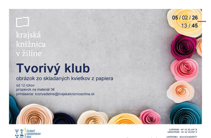Hľadáte kreatívny relax alebo si chcete vytvoriť milý darček pre vášho blízkeho? Pozývame vás na oddychové tvorivé popoludnie, počas ktorého si vyrobíte originálny obrázok v tvare srdca zo skladaných papierových kvietkov. Na podujatí si vyskúšate jednoduché techniky skladania papiera, kombinovanie farieb a aranžovanie drobných dekorácií do harmonického celku. Tvorivé dielne sú vhodné pre záujemcov od 12 rokov. Z kapacitných dôvodov je nutné prihlásenie cez email: [email protected]. Príspevok na materiál je 3 €.