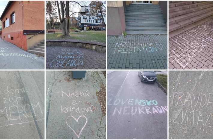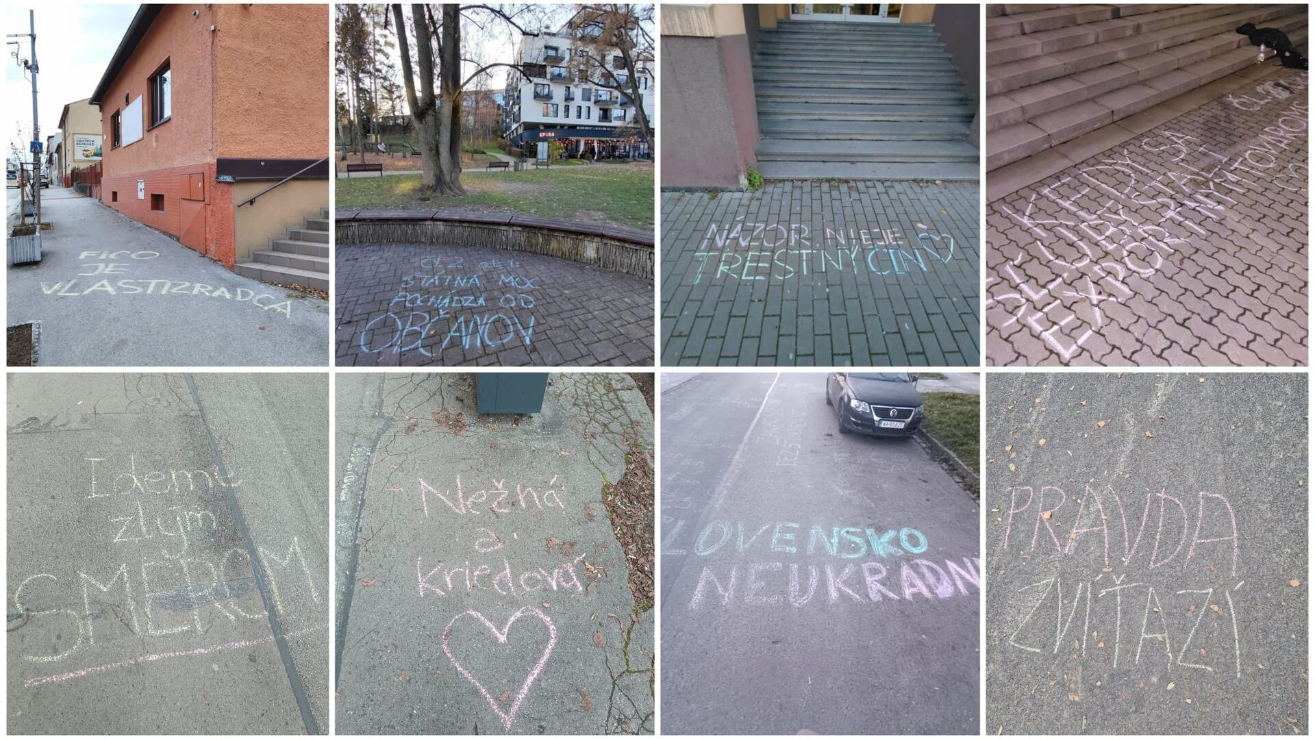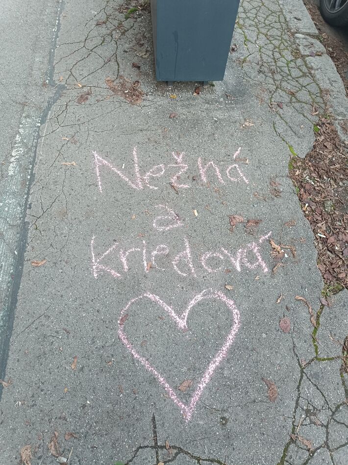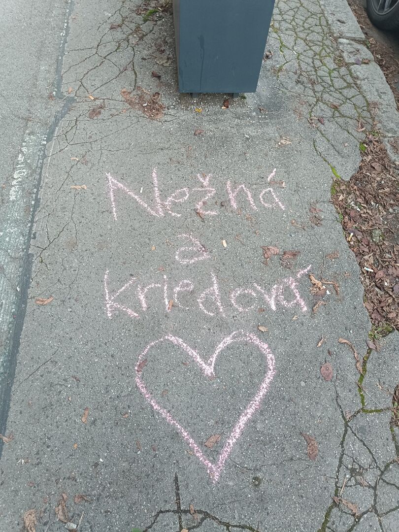 Farebnými kriedami sú na zemi napísané odkazy ako „Ideme zlým smerom“. „Slovensko neukradnú“, „Nežná a kriedová“ či kritické odkazy adresované vláde. Videli sme ich napríklad v okolí Mariánskeho námestia, na Bulvári, v Bôrickom parku, na Národnej ulici, v Sade na Studničkách či v okolí žilinských stredných škôl. Jednotlivé vety sa objavujú spontánne – niektoré pribudnú ráno cestou do školy, iné podvečer cestou domov.