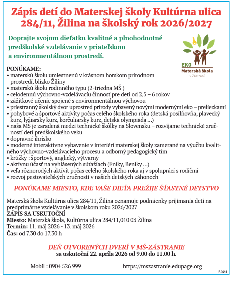 Pozývame vás na Deň otvorených dverí na miesto, kde sa spája kvalitné predškolské vzdelávanie s láskavým prístupom, pohybom, prírodou a zážitkovým učením. V príjemnom rodinnom prostredí čaká na deti množstvo aktivít, nových kamarátstiev a podnetov pre ich zdravý rozvoj.