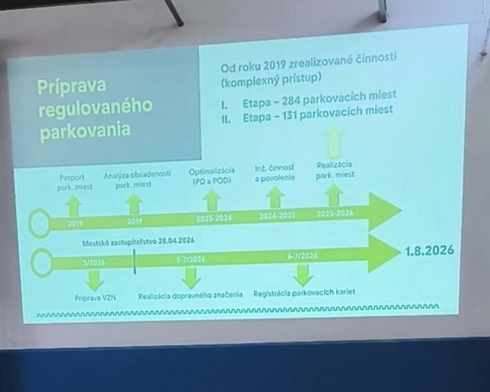 Z prezentovaných údajov vyplýva, že príprava regulovaného parkovania v Žiline prebiehala niekoľko rokov. Od roku 2019 mesto realizovalo konkrétne kroky, pričom v prvej etape vzniklo 284 parkovacích miest a v druhej etape ďalších 131. Proces zahŕňal analýzy obsadenosti, optimalizáciu parkovacej politiky, povoľovacie konania aj samotnú realizáciu.