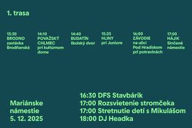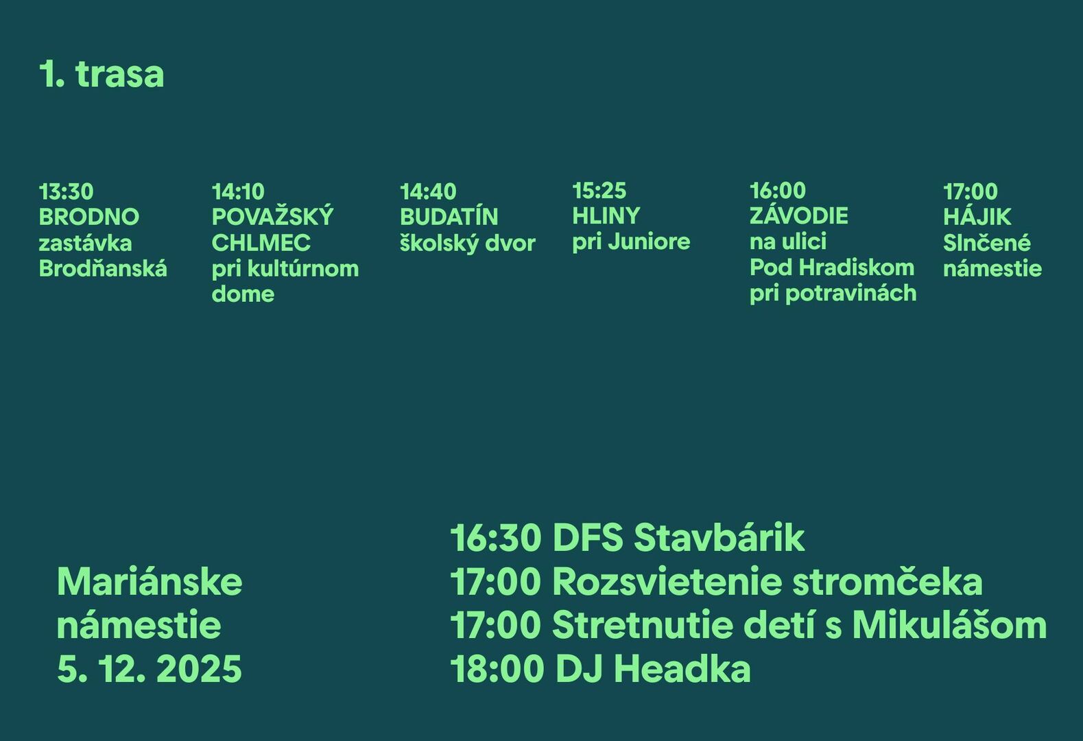 1. trasa odštartuje o 13:30 v Brodne, odkiaľ bude Mikuláš pokračovať cez Považský Chlmec, Budatín, Hliny, Závodie a svoju cestu zakončí o 17:00 na Hájiku.