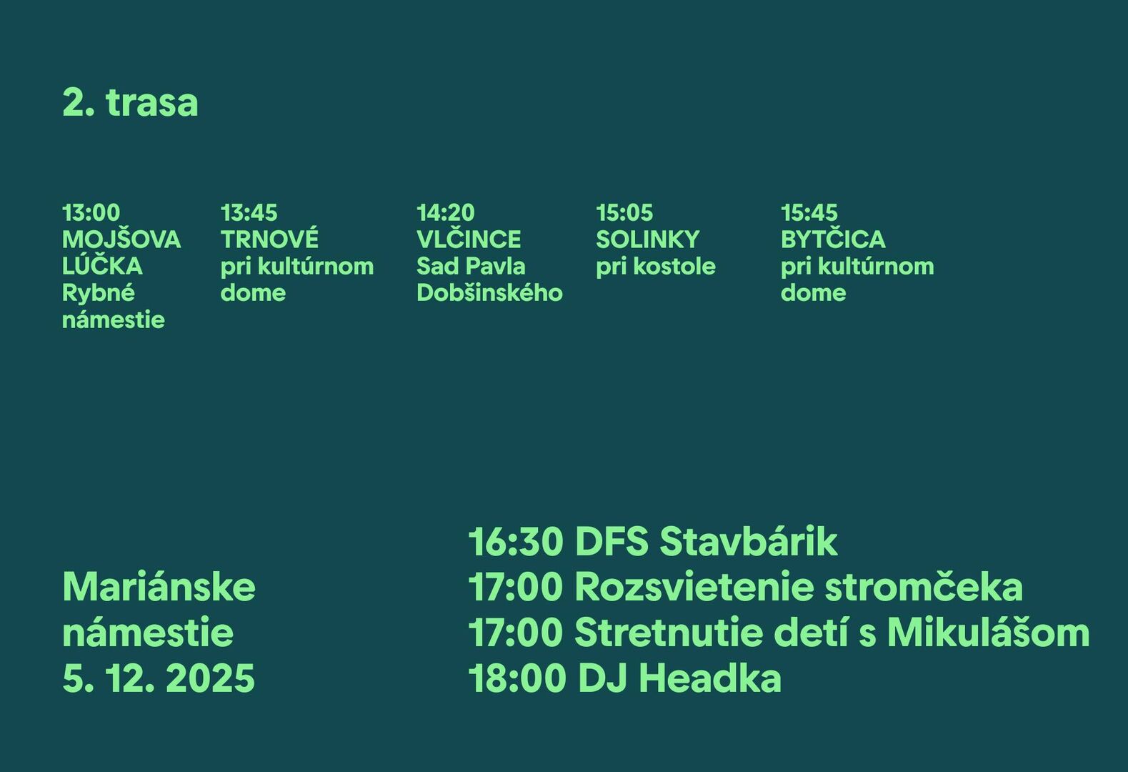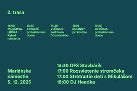 2. trasa začne o 13:00 v Mojšovej Lúčke a povedie cez Trnové, Vlčince, Solinky a Bytčicu, kde sa Mikuláš zastaví pred kultúrnym domom o 15:45.
