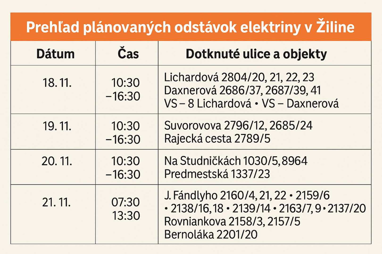 Práce prebehnú v dopredu stanovených časoch a dotknú sa viacerých mestských častí vrátane Vlčiniec, Hliny, Soliniek či Predmestskej oblasti. Výpadky elektriny budú mať prevažne denný charakter – väčšinou v čase od 10.30 do 16.30 hod, v jednom prípade od 7.30 do 13.30 hod.