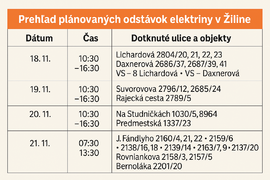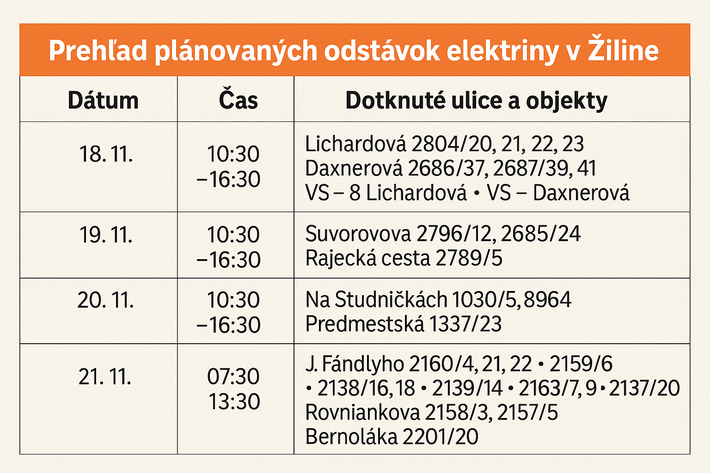 Spoločnosť Stredoslovenská distribučná, a. s., oznámila, že v priebehu týždňa od 18. do 21. novembra 2025 bude v niektorých lokalitách mesta Žilina prerušená distribúcia elektriny. Dôvodom sú plánované práce na zariadeniach distribučnej sústavy.