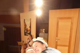 Radovan: Naša herečka Adelka stratila hlas týždeň pred predstavením, tak to náš zvukár vyriešil mikrofónom, aby ju bolo vôbec počuť.