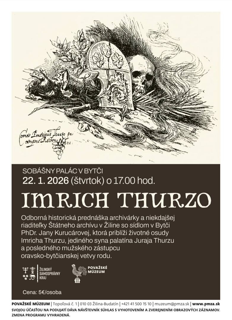 Viac sa o osude Imricha Thurzu dozviete na prednáške historičky Jany Kurucárovej vo štvrtok 22. januára 2026 o 17.00 v Sobášnom paláci v Bytči. Podujatie priblíži nielen historický kontext, ale aj pútavé dobové svedectvá o živote a smrti posledného mužského potomka tejto vätvy rodu Thurzo.