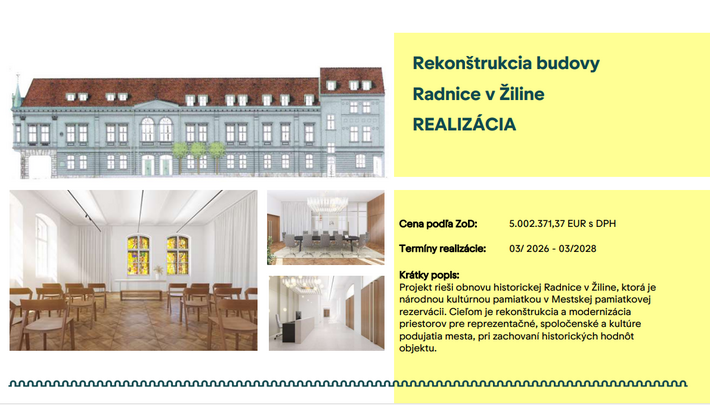 Podľa vedúceho odboru riadenia projektov a investícií Radovana Martinčeka ide o rozsiahly zásah. „Je vybratý dodávateľ, realizácia začala v tomto mesiaci a projekt je nastavený na 24 mesiacov. Ide o kompletnú rekonštrukciu, pričom riešime nielen samotnú budovu, ale aj interiérové vybavenie a celkové fungovanie radnice,“ priblížil.