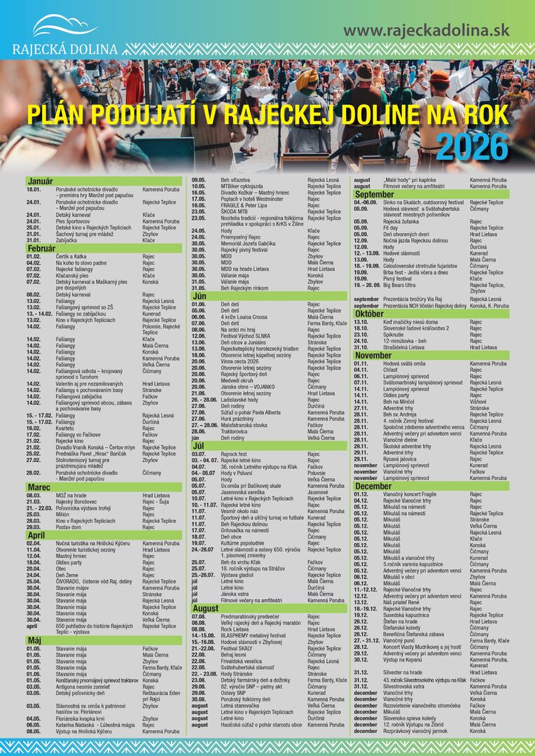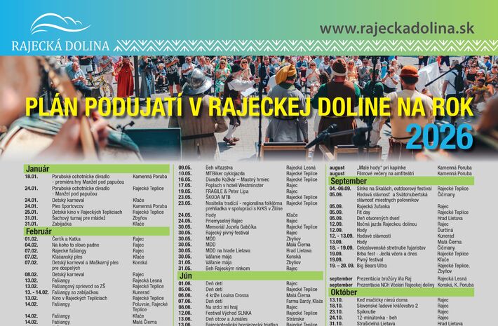 Plán podujatí na rok 2026, ktorý zostavila Oblastná organizácia cestovného ruchu Rajecká dolina v spolupráci so svojimi členmi a partnermi prináša ponuku desiatok akcií určených pre miestnych obyvateľov, ale aj turistov a návštevníkov regiónu – od začiatku až po koniec roka.