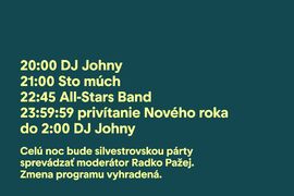 „Príďte sa rozlúčiť so starým rokom a privítať ten nový priamo na námestí! Čaká vás skvelá atmosféra, hudba, radosť, stretnutia s priateľmi a spoločné odpočítavanie posledných sekúnd roka,“ pozývajú organizátori.