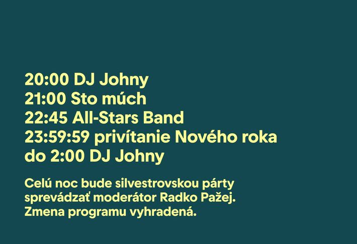 „Príďte sa rozlúčiť so starým rokom a privítať ten nový priamo na námestí! Čaká vás skvelá atmosféra, hudba, radosť, stretnutia s priateľmi a spoločné odpočítavanie posledných sekúnd roka,“ pozývajú organizátori.