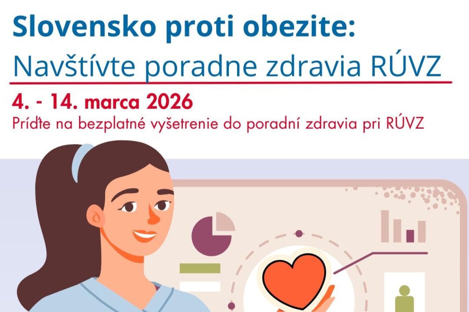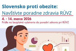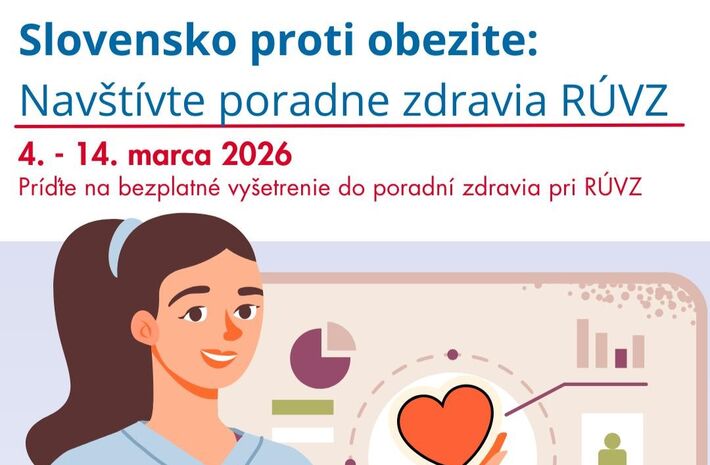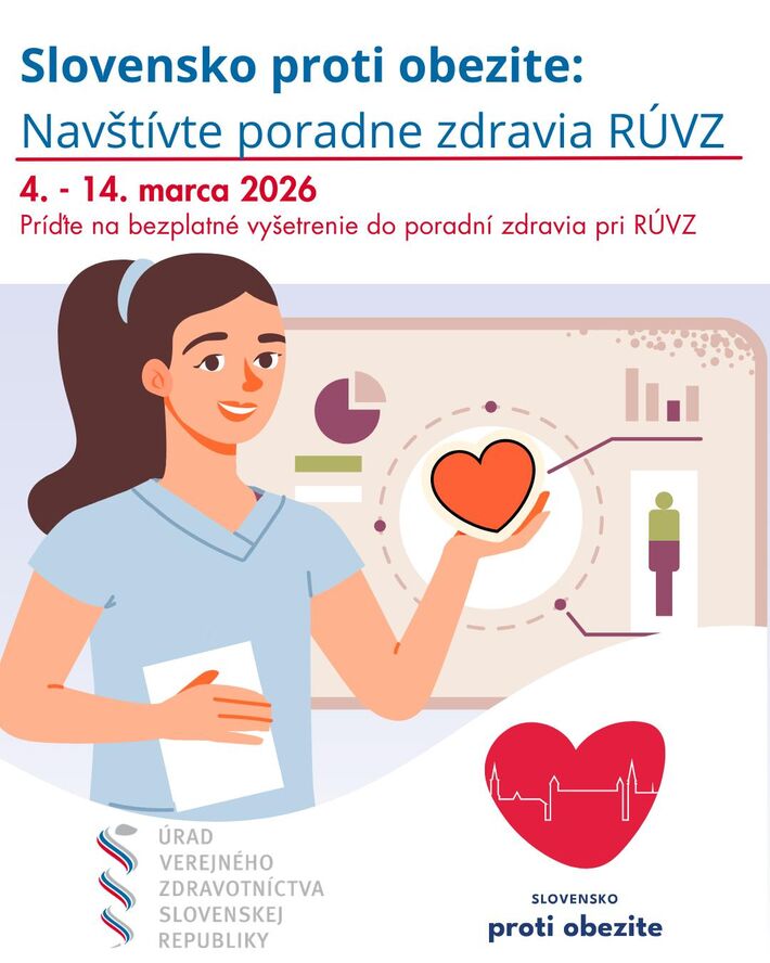 Úrad verejného zdravotníctva SR spúšťa v marci aktivitu v rámci projektu Slovensko proti obezite. Do iniciatívy sa zapojilo 34 poradní zdravia. „34 poradní zdravia pri regionálnych úradoch zdravia (RÚVZ) sa zapojilo do projektu Slovensko proti obezite. Jeho hlavným cieľom je prispieť k ochrane verejného zdravia, priniesť merania dôležité v diagnostike obezity bližšie k ľuďom a zlepšiť povedomie verejnosti o obezite ako chorobe.“ Od 4. do 14. marca si môžu záujemcovia v poradniach overiť viaceré zdravotné ukazovatele, ktoré súvisia s nadváhou a celkovým zdravotným stavom.