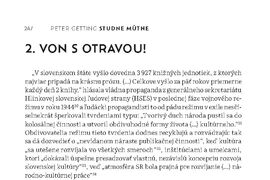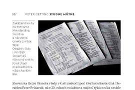 Sú ikonickými postavami našej kultúry. Postavili im sochy a pomenovali po nich ulice, majú svoje nespochybniteľné miesto v lexikónoch literatúry aj učebniciach, slovenské moderné umenie sa bez nich nedá predstaviť. Nová publikácia Petra Gettinga však odkrýva aj iný obraz známych slovenských literátov a prejavy umeleckej kolaborácie s režimom v období vojnového Slovenského štátu. Mapuje a pomenúva aktivity a osudy autorov a ich diel zoči-voči mechanizmom moci a dospieva k zisteniam, o ktorých sa desaťročia mlčí, vrátane podielu samotných umelcov na inštalácii, existencii a podpore režimu porušujúcom elementárne ľudské práva a dopúšťajúcom sa zločinov proti ľudskosti.