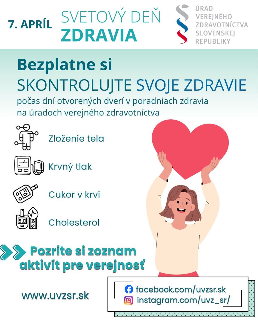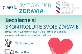 Svetový deň zdravia nie je len symbolickou pripomienkou starostlivosti o zdravie. Na Slovensku ho sprevádzajú aj konkrétne aktivity pre verejnosť. Regionálne úrady verejného zdravotníctva pripravili počas celého apríla dni otvorených dverí v poradniach zdravia, kde si môžu ľudia bezplatne skontrolovať svoj zdravotný stav.