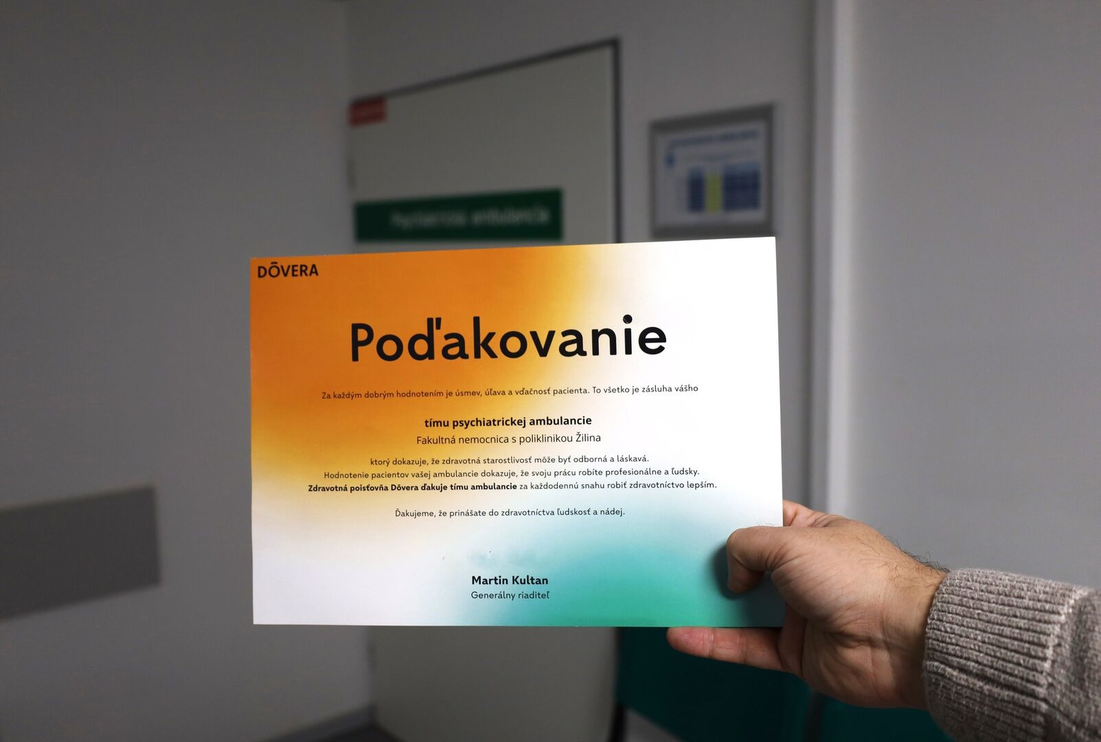 V poďakovaní poisťovne sa uvádza: „Za každým dobrým hodnotením je úsmev, úľava a vďačnosť pacienta. To všetko je zásluha vášho tímu psychiatrickej ambulancie, ktorý dokazuje, že zdravotná starostlivosť môže byť odborná a láskavá. Hodnotenie pacientov vašej ambulancie dokazuje, že svoju prácu robíte profesionálne a ľudsky. Zdravotná poisťovňa Dôvera ďakuje tímu ambulancie za každodennú snahu robiť zdravotníctvo lepším. Ďakujeme, že prinášate do zdravotníctva ľudskosť a nádej."