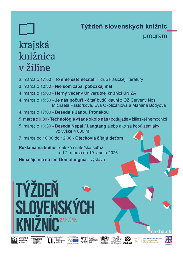 Hlavným podujatím bude 6. ročník celoslovenskej udalosti Je nás počuť. V tento deň knižnice v rovnakom čase (4. marca o 15.30 h) spoločne upozornia na dôležitosť čítania a krásu literatúry. Po prvýkrát bude mať podujatie aj medzinárodný rozmer – zapoja sa aj knižnice z Českej republiky a Poľska. Pozvanie do krajskej knižnice prijali zdravotní klauni z občianskeho združenia Červený nos. „Čítanie kníh je skvelý zdroj inšpirácie aj forma psychohygieny,“ približujú. Dlhoročné zdravotné klaunky Michaela Pastorková, Eva Okoličániová a Mariana Bódyová prečítajú humorné i dojímavé príbehy z kníh Malé zázraky a Na zázraky máme nos. Sú to knihy plné skutočných príbehov, ktoré zdravotní klauni zažili počas svojich návštev detí v nemocniciach či dospelých v domovoch seniorov.