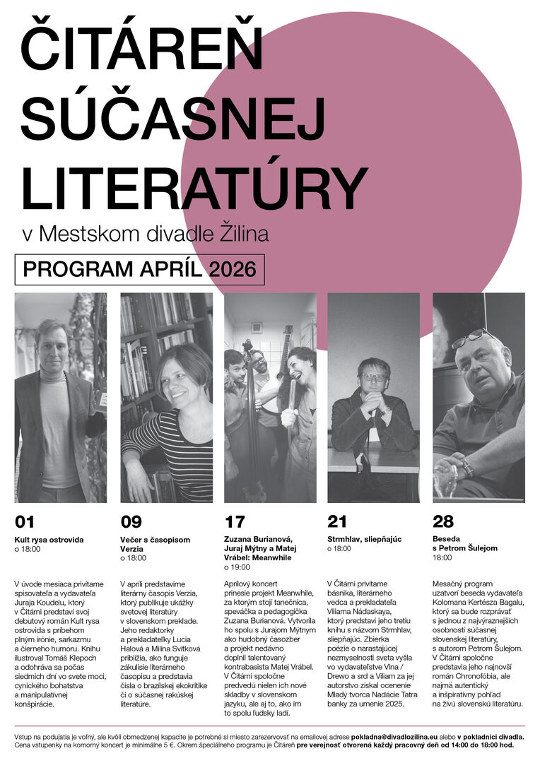 Vstup na podujatie je voľný, ale kvôli obmedzenej kapacite je potrebné si miesto zarezervovať cez email [email protected] alebo v pokladnici divadla.