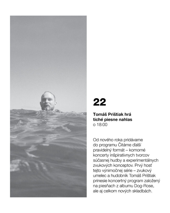 Zvukový umelec a hudobník Tomáš Prištiak prinesie do Čitárne svoj súčasný koncertný program založený na piesňach z albumu Dog-Rose, ale aj celkom nových skladbách.